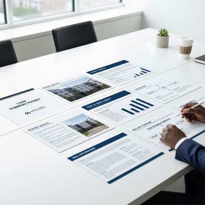 - An executive summary providing a concise overview of key points immediately orients lenders to your opportunity. This one-page distillation should highlight property fundamentals, loan request details, planned improvements, exit strategy, and relevant borrower experience.